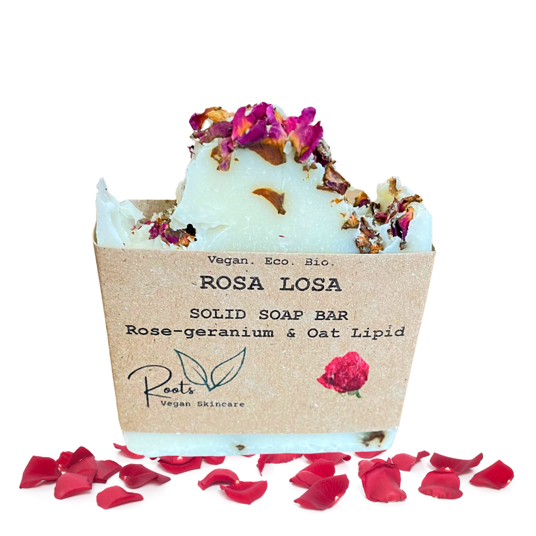 Rosa Losa is made with lashings of Rose Geranium and French Lavender essential oils and fragrant red rose petals making it suitable for all skin types, including normal and sensitive skins and related problems. Blended with African coconut, macerated calendula and oat lipids to repair damaged skin. This bar can be used on the body and hands.