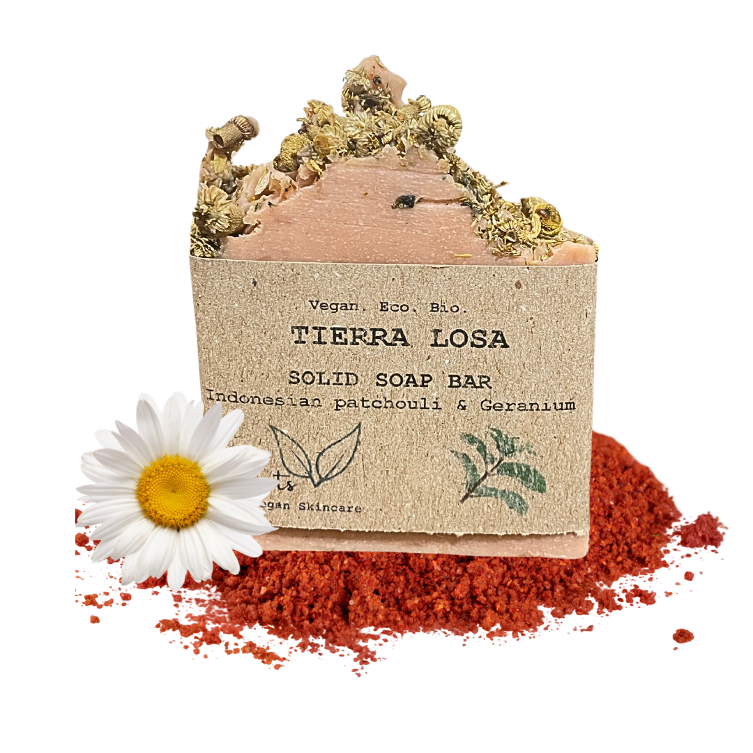 Tierra Losa bar is our most earthy bar yet! Made with cleansing red French clay and Indonesian patchouli and Egyptian geranium essential oils then topped with chamomile flowers. This bar can be used on the body and hands.
