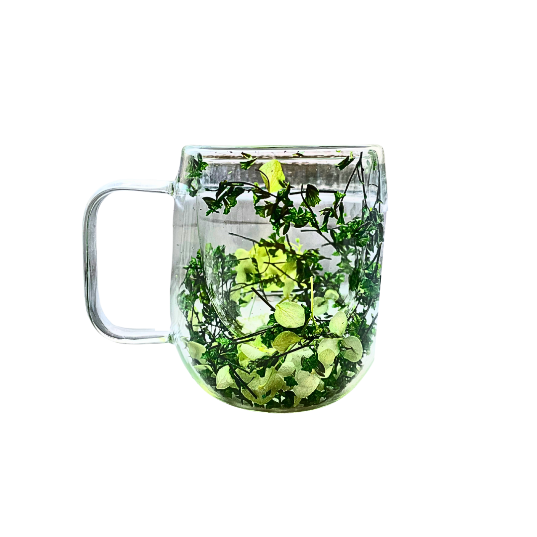 Take your favourite beverage to the next level with our double-walled insulated and heat-resistant glass mugs with real dried flowers inside! Can be used for hot and cold drinks. Made from high borosilicate glass.